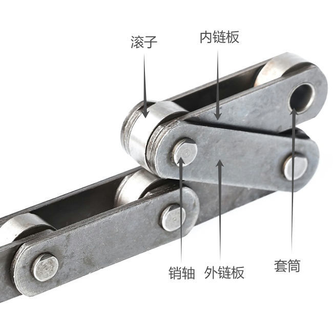 套筒滾子鏈由內(nèi)鏈板、外鏈板、套筒、銷軸、滾子及鏈條附件組成。